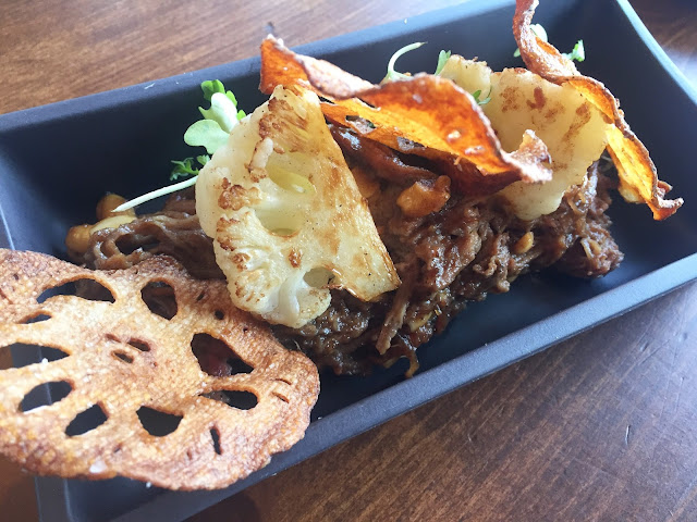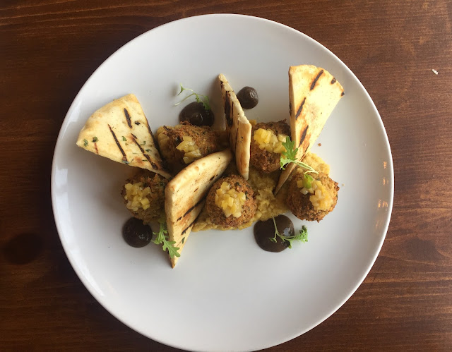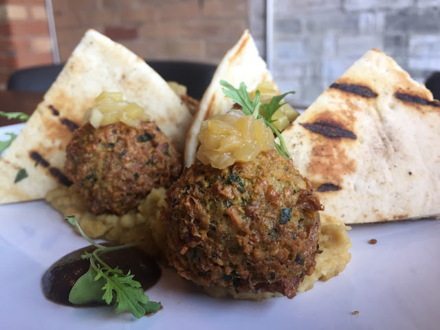 The menu features many shareable items and main dishes. The first shareable dish I tried was the Tamarind Beef which is incredibly tender beef brisket cooked in a date sauce and served with cashews, cauliflower and lotus root chips. I for one would not share this dish with anyone. I happily ate this entire thing on my own and was in flavour heaven. I can’t remember the last time I had such tender and juicy beef doused in an incredible sauce. This is a must-try dish at Hungry Amoo! The next sharing dish I tried was the Falafelserved with pita, hummus, charred tomato and pickled mango. The falafel tasted quite traditional but I found it to be a bit dry. The hummus was warm and flavourful and the pickled mango was a great sweet addition to this dish.